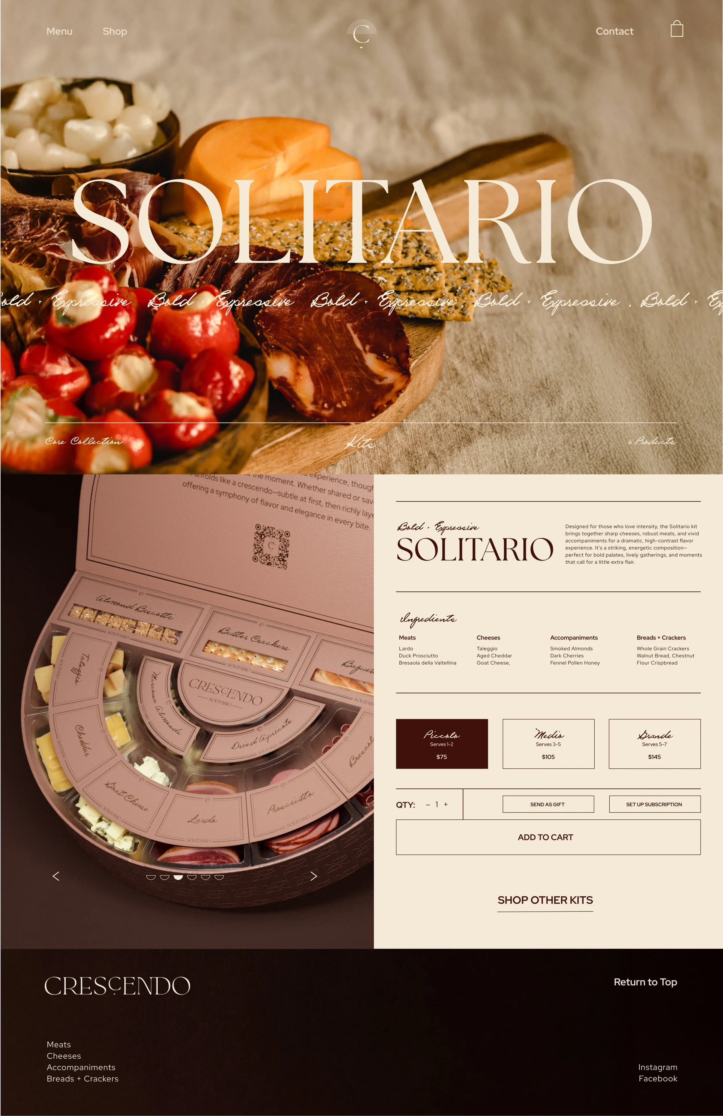 The splash page welcomes you with our finest charcuterie kits, then introduces the Crescendo structure where you can choose the option that suits you best.