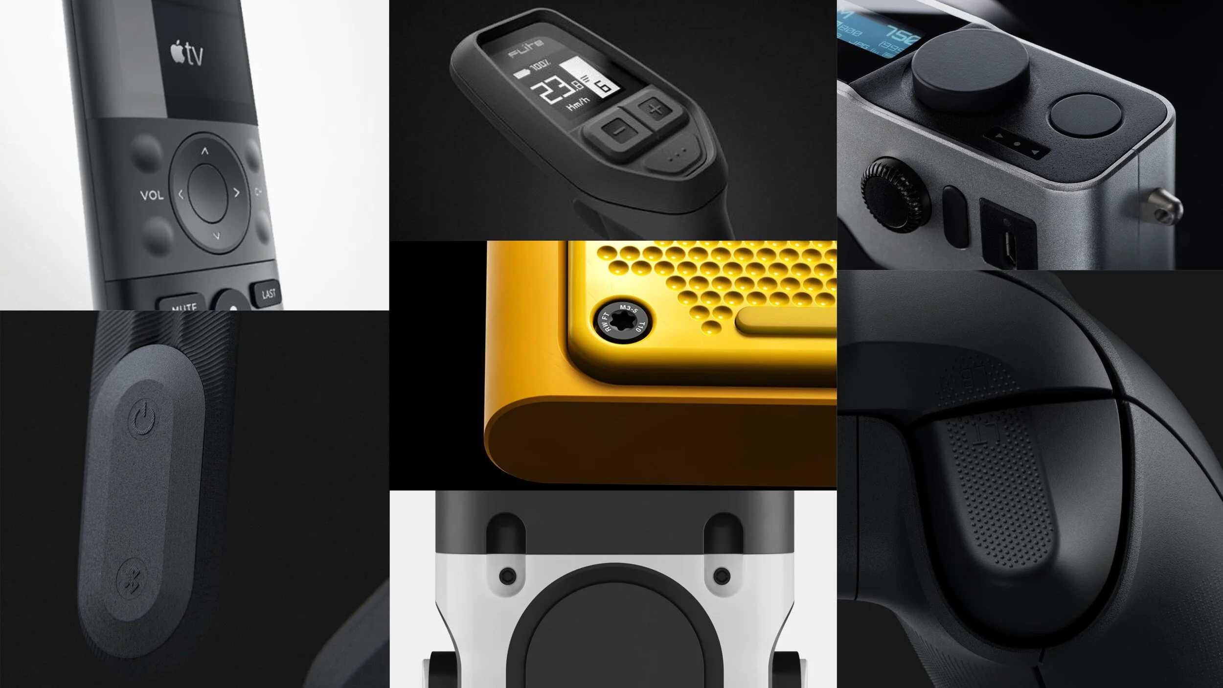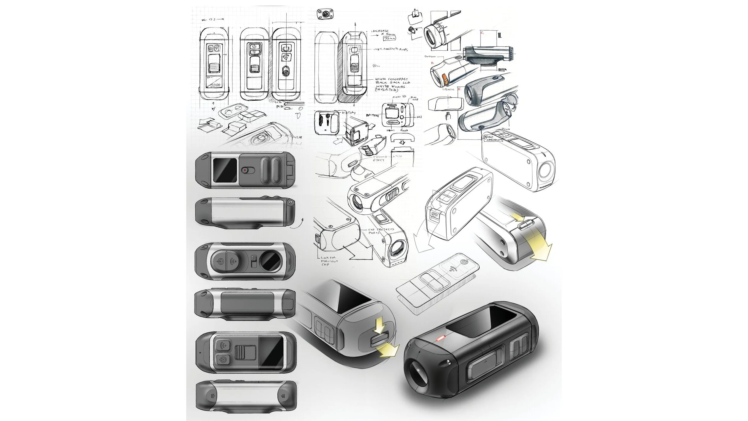 We pulled inspiration from forms that communicated durability. Exposed fasteners, heavy texture, and the use of silicone over-molded parts all communicated reliability and tactility.