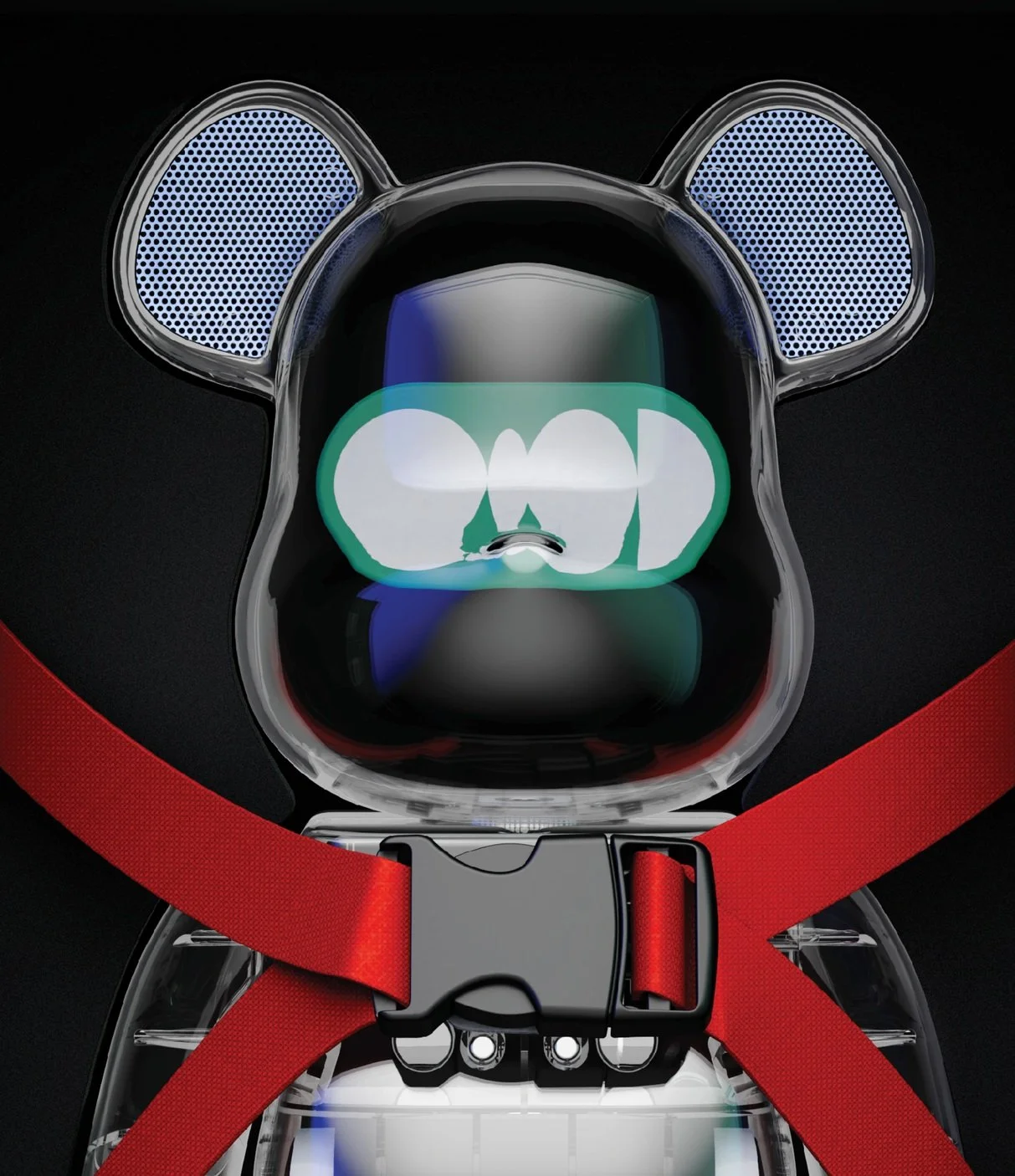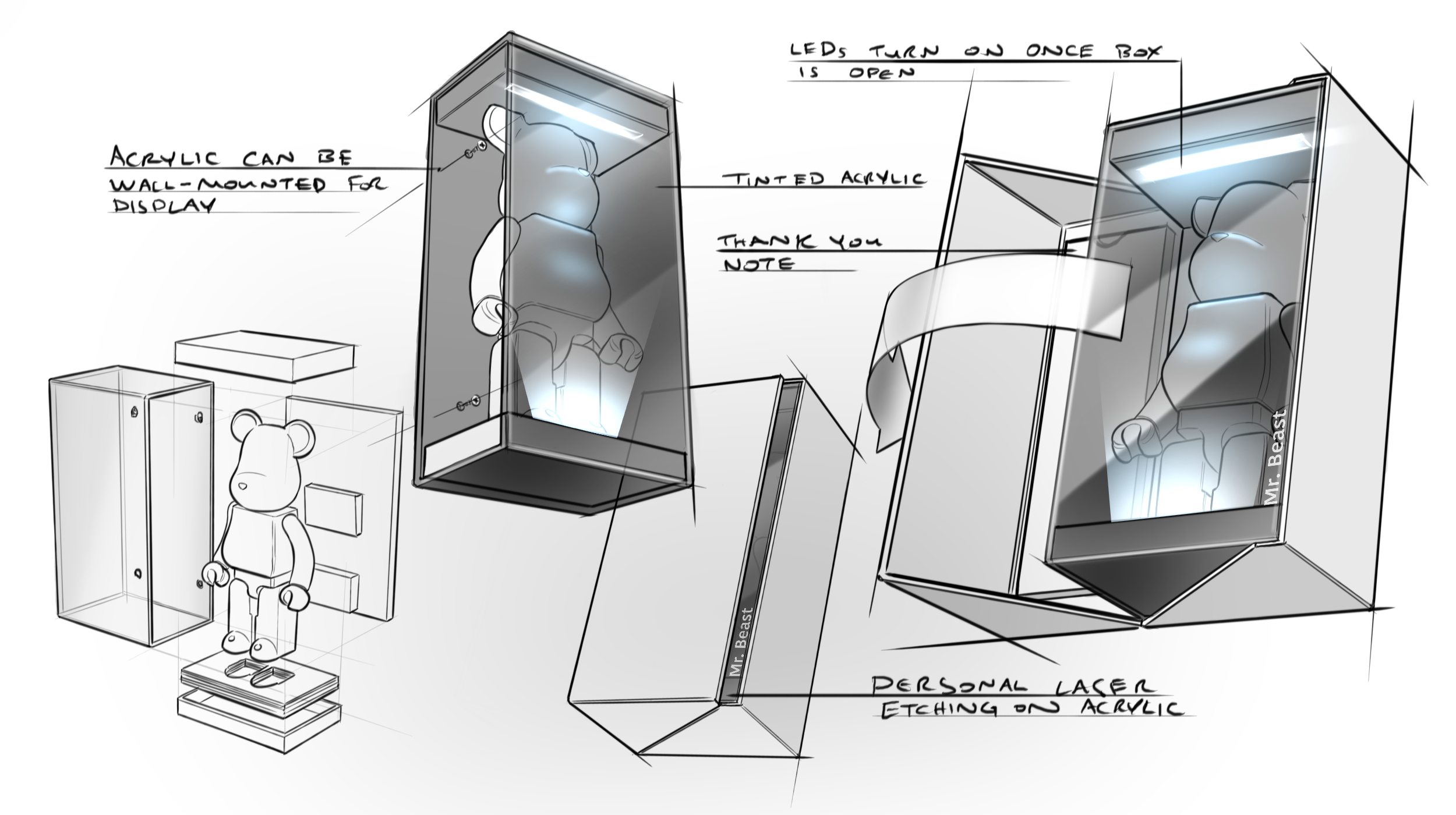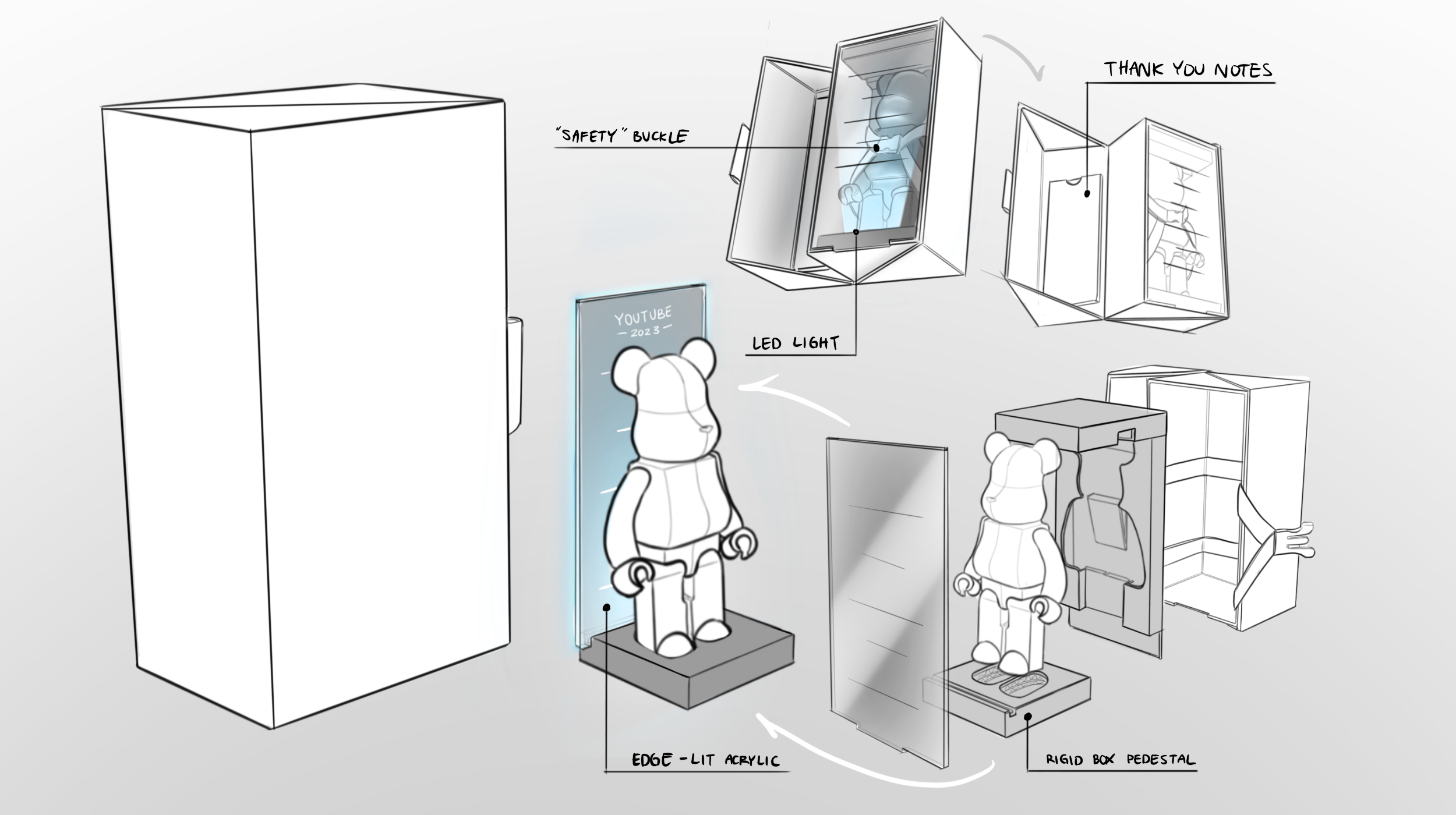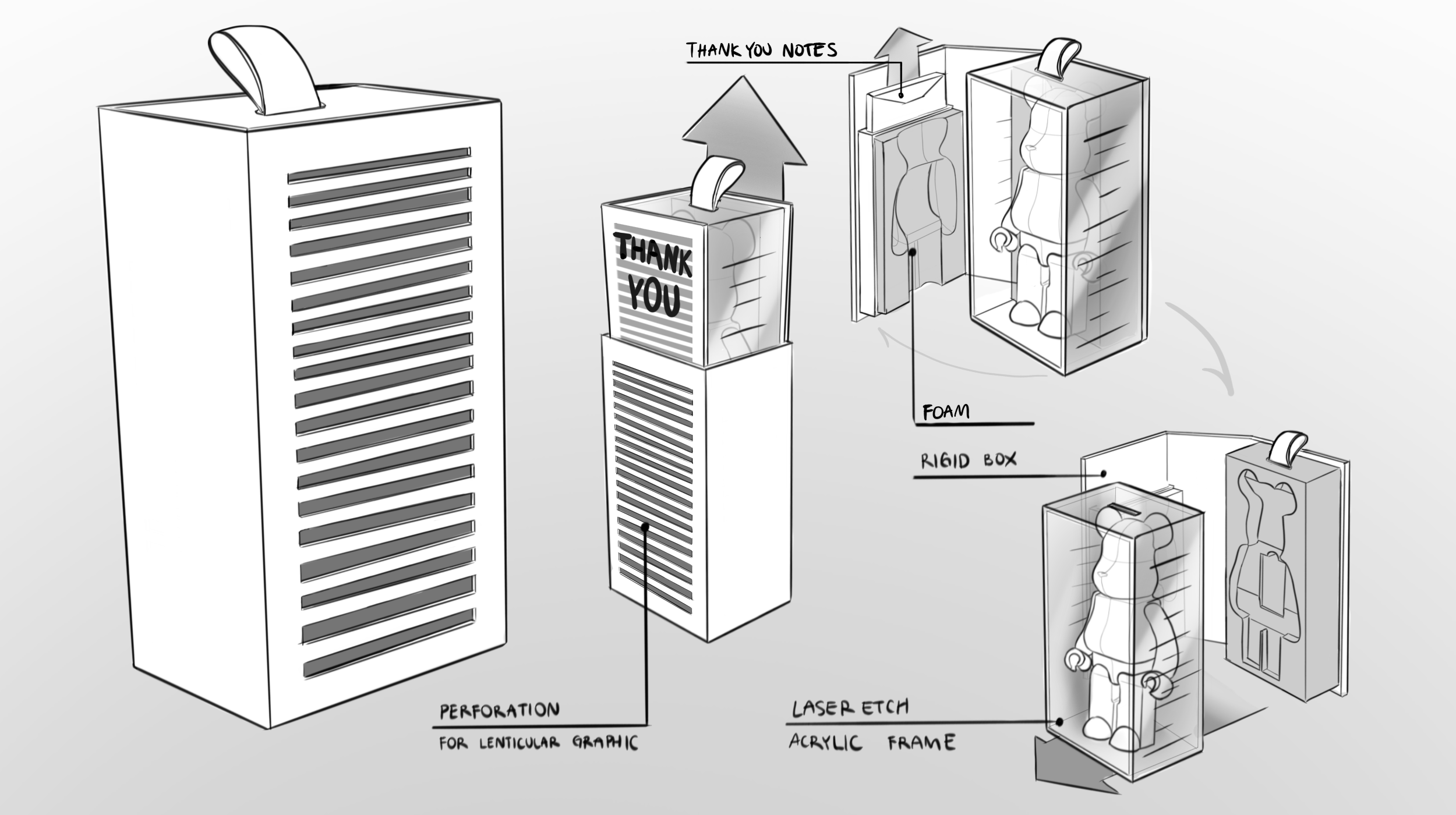 The frame recognized the creator and artist’s accomplishments and served as a keepsake display case to heroically showcase their BE@RBRICK AUDIO. This frame gives off a hologram effect that perfectly complements the transparency of the bear. To not compromise the audio experience, we designed a frame with an open front and back.