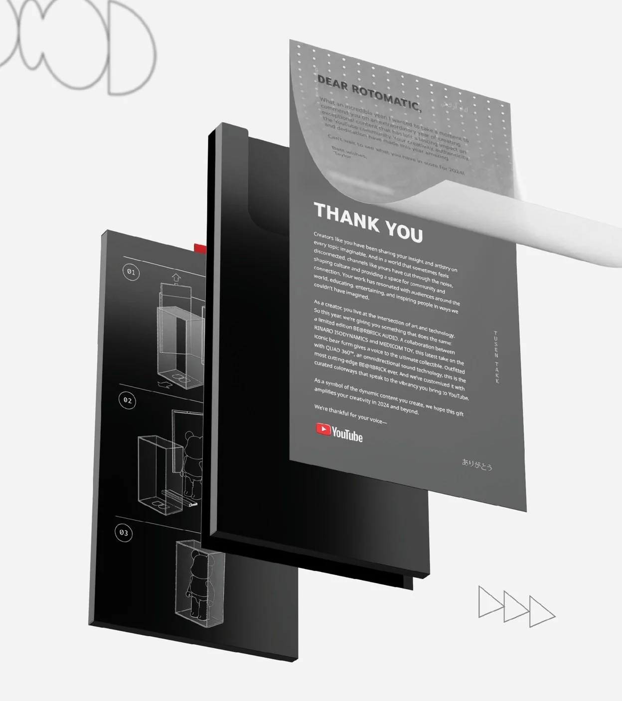 STORYAt the end of each year, YouTube shows gratitude to some of its most influential creators and artists from around the world with a one-of-a-kind, personalized gift. In collaboration with YouTube, our goal was to curate an unforgettable gift, design a show-stopping unboxing experience, and, most importantly, demonstrate YouTube’s gratitude for all the efforts of its creator and artist community throughout 2023.
