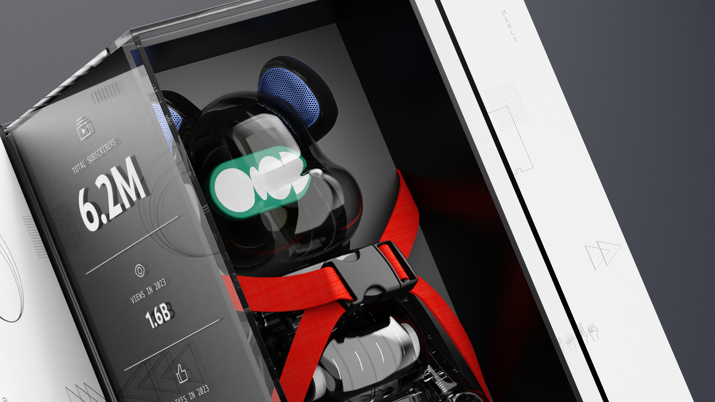 THE SEATBELTThe BE@RBRICK AUDIO is situated securely at the box's center and displayed in true streetwear style—held in place by a custom YouTube red seat belt. The seat belt served two purposes: it kept the bear in place during transit and allowed the opportunity to make a bold design statement. We introduced a foam piece inside the box that cushioned the bear's back half while the seat belt kept it secure from the front. This allowed for the bear to be proudly on display upon opening the layers of the box, making for a dramatic reveal.
